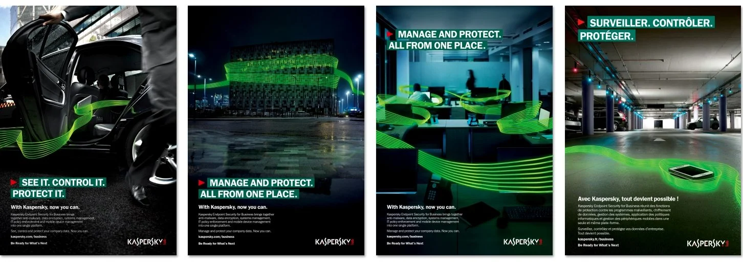 For the launch of Kaspersky Endpoint Security for Business I created a simple ‘Protective’ light-trail visual to bring ‘See it. Control it. Protect it’ to life. The global campaign was designed to drive consideration and demand for the new solution. It incorporated live webinar events, emarketing, online advertising, content marketing, events, social media, analyst activity and partner co-marketing and was delivered across 40 countries in 18 languages.